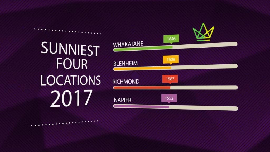 Whakatane continues to have the most sunshine hours for 2017 according to the latest information from the National Institute of Water and Atmospheric Research (NIWA's). With 1646 hours Whakatane is in the lead ahead of Blenheim, Richmond & Napier.
