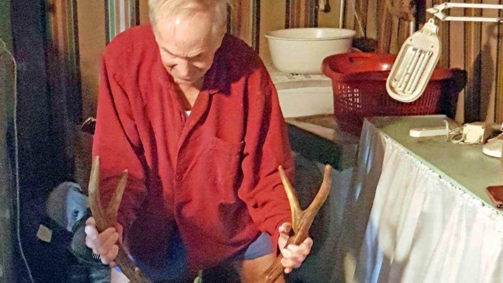Awakeri Hot Springs resident Bob McNeil, 90, calls it a "chance in a million" to have a stag chased into his caravan by hunters and pig dogs.