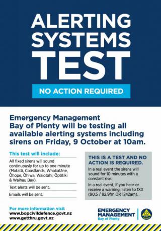 Emergency Management Bay of Plenty will be testing all available alerting systems including sirens on Friday 9 October, 10am.