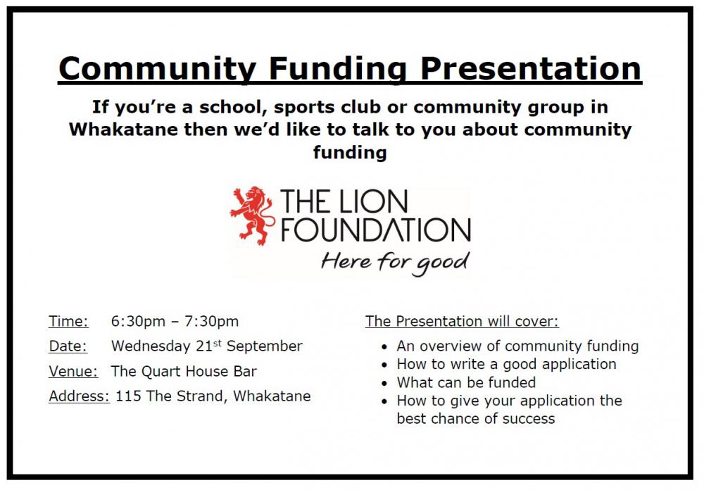 The Lion Foundation Community Funding Forums will outline how the community funding model works, what can/can’t be funded and how to write a quality application. The presentation itself takes about 30 minutes and we’ll then stay around as long as it takes to answer your questions.