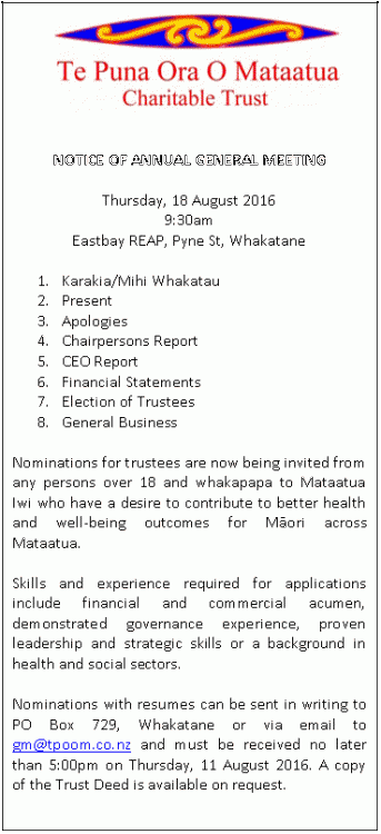 Nominations for trustees are now being invited from any persons aged over 18 years old and whakapapa to Mataatua Iwi who have a desire to contribute to better health and well-being outcomes for Maori across Mataatua.