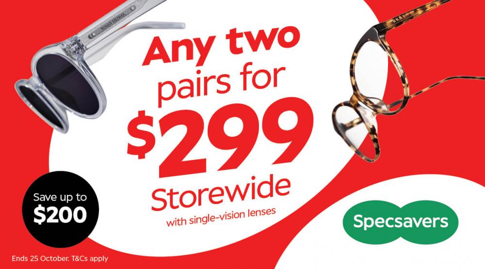 Any two pairs for $299 with single-vision lenses, storewide!