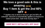 Applies only to items in the buy1 get 2nd 60% off collection, discount is automatically applied at checkout to lowest priced item.