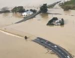 Roads and properties can be seen completely submerged, with vehicles attempting to negotiate the floodwaters.